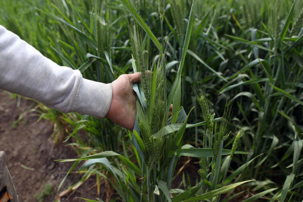 2022年3月14日,农民在埃及盖勒尤卜省的农田中展示麦穗。新华社发(艾哈迈德·戈马摄)