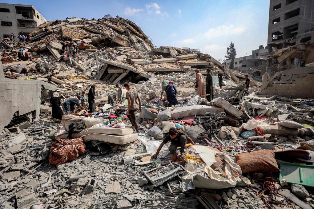 9月15日,人们在加沙城查看遭以军袭击后的废墟。新华社/法新
