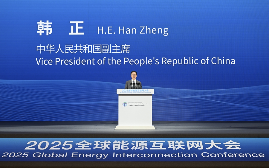 9月9日,国家副主席韩正在北京出席2025全球能源互联网大会并致辞。新华社记者 张领 摄