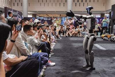 7月6日,浙江省金华市金华之光文化广场科技馆内,人形机器人与观众互动。 新华社发(时宽兵 摄)