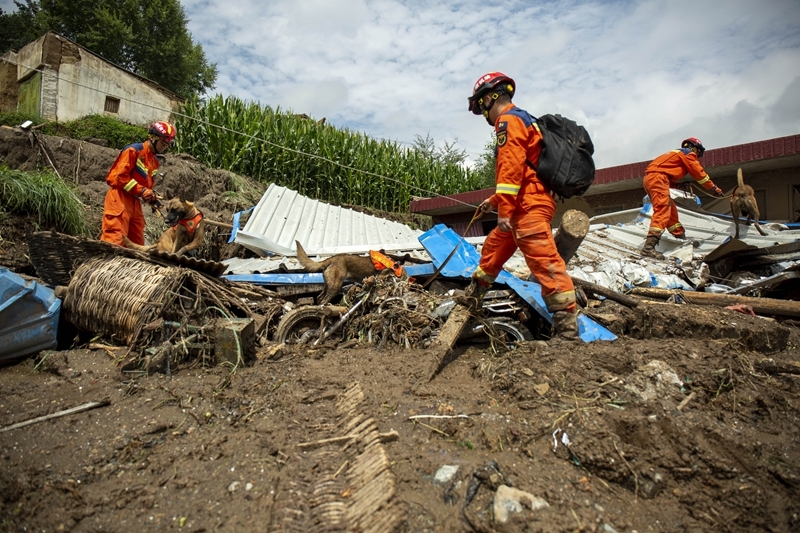 8月9日,国家西北区域应急救援中心指战员在马坡乡旧庄沟村利用搜救犬搜救失联人员。