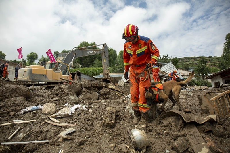 8月9日,国家西北区域应急救援中心指战员在马坡乡旧庄沟村携带搜救犬配合大型机械搜救失联人员。