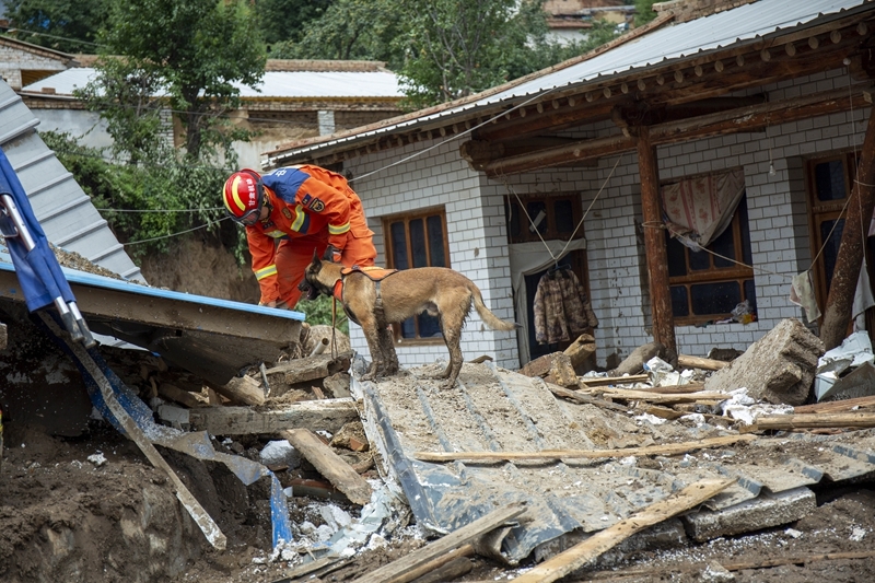 8月9日,甘肃省森林消防总队消防员在榆中县马坡乡旧庄沟村利用搜救犬搜救。
