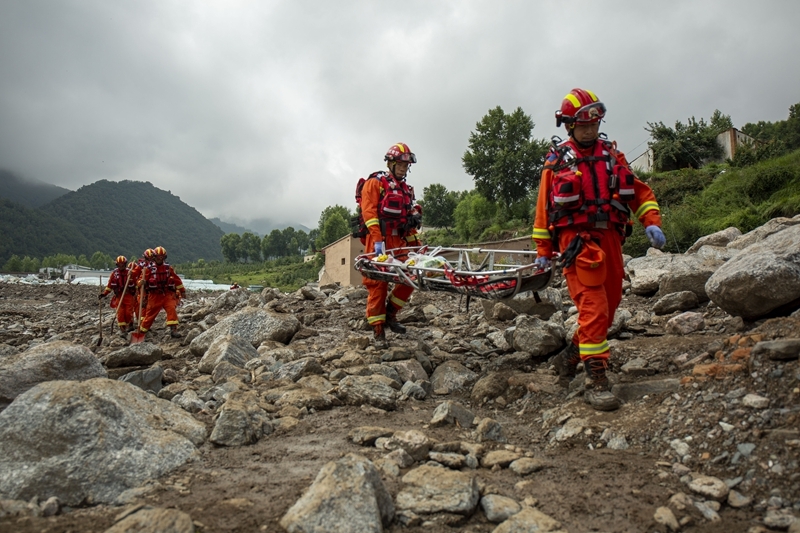 8月9日,国家西北区域应急救援中心指战员在马坡乡旧庄沟村携带救援担架沿河道搜救失联人员。