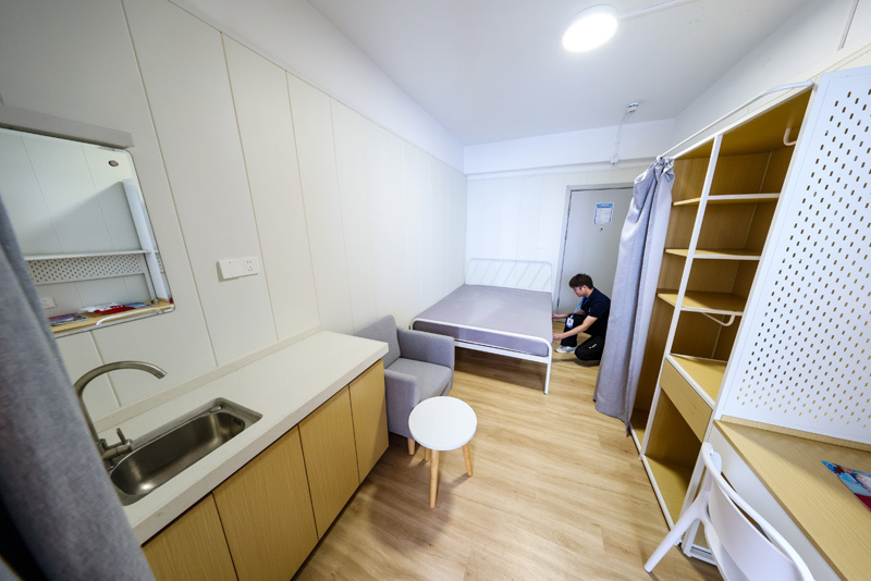 在深圳市龙华区白石龙老村44栋,安居乐寓公司的管理员在用于“深梦扬帆”免费短期公益住房的公寓房内整理床铺(2025年8月25日摄)。新华社记者 毛思倩 摄