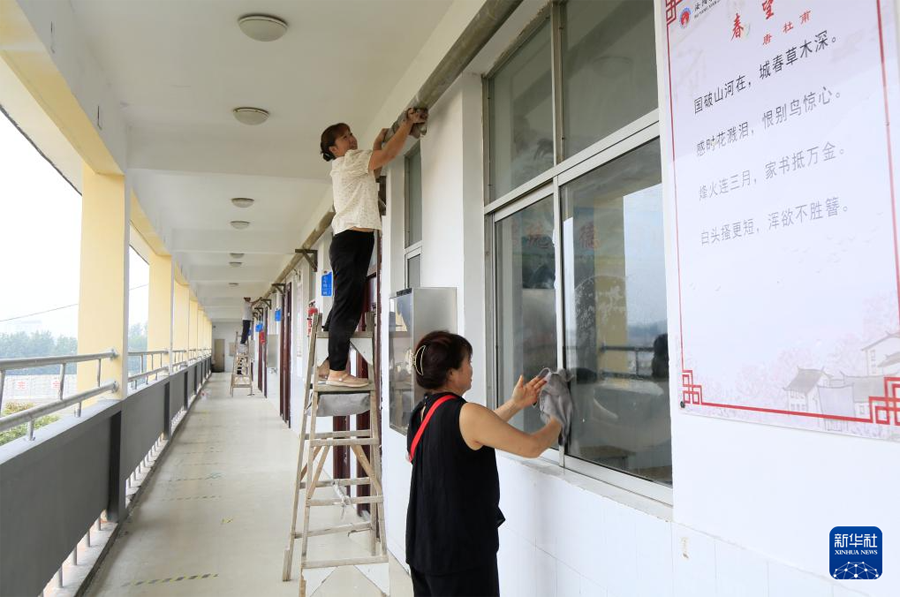 8月25日,工作人员在河南省洛阳市汝阳县直属初级中学进行校园卫生清理。(新华社发 康红军/摄)