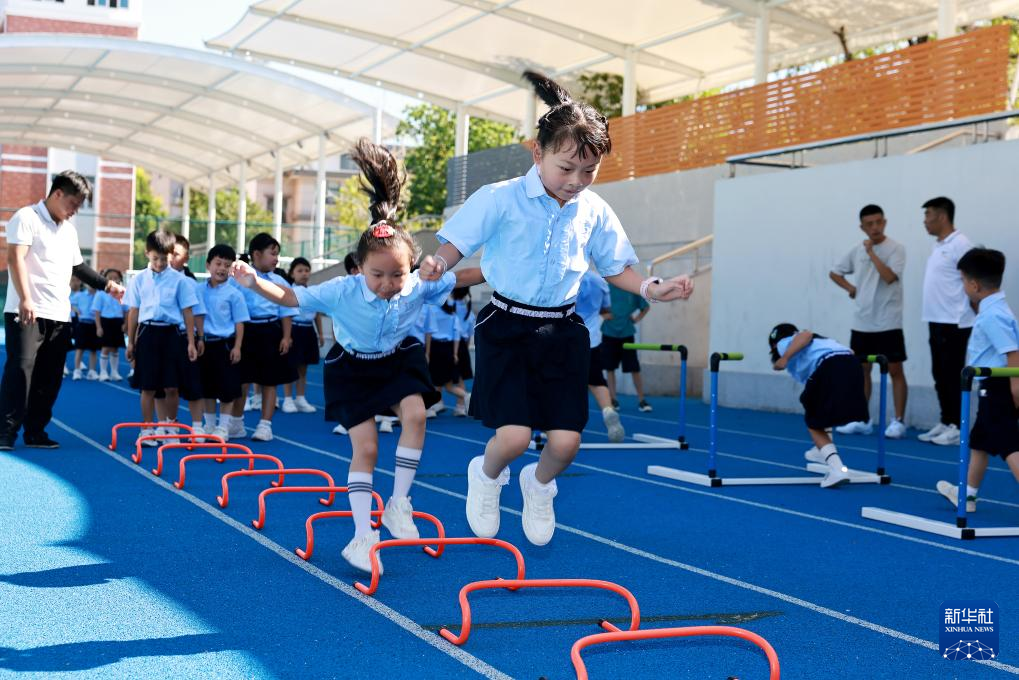 8月30日,在山东省荣成市府新小学,小学生们跨越“成长跨栏”,步入新学期。