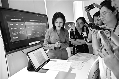 一名工作人员在科大讯飞人工智能体验馆介绍AI学习机的批改作业功能。 新华社记者 张铖 摄