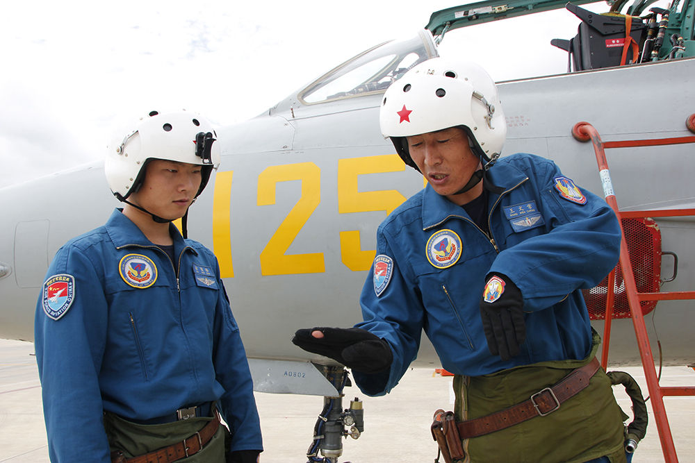 夜航结束后,走下战机的王文常(左)及时纠正带教新员飞行技术问题(资料图片) 。新华社发(张恒平 摄)
