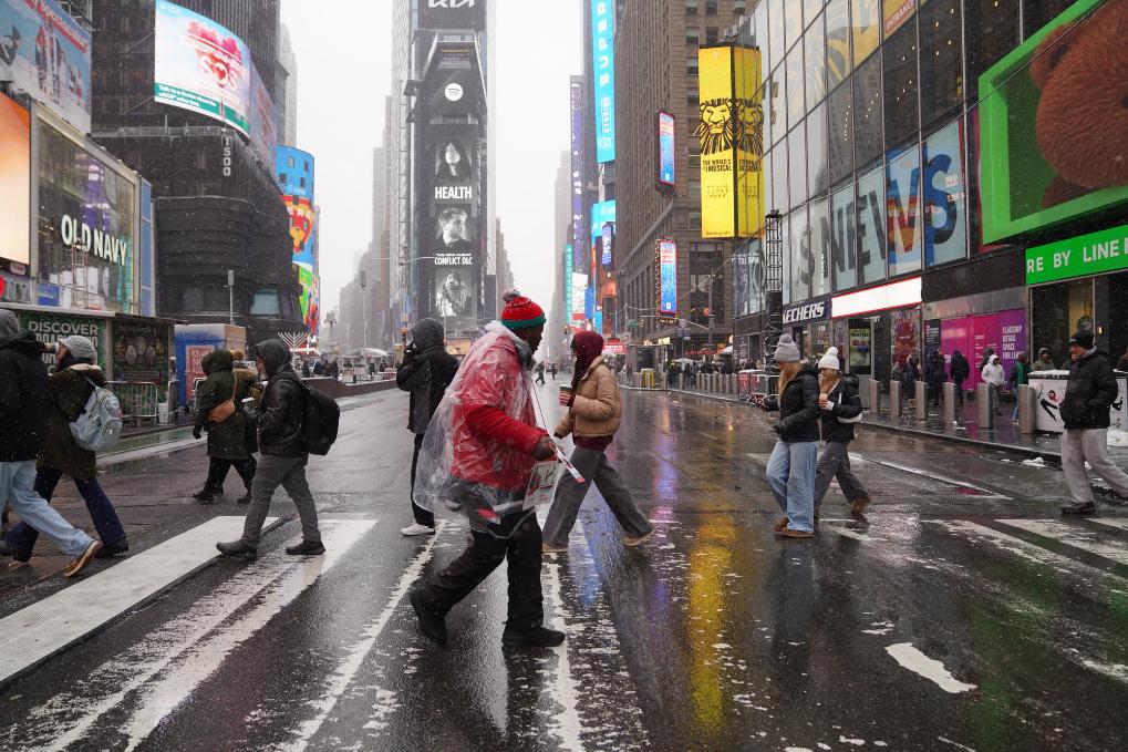 12月14日,在美国纽约曼哈顿时报广场,人们在雪中穿过街道。新华社记者张凤国摄