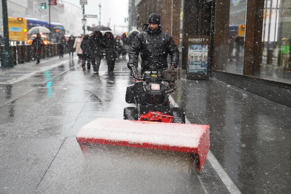 12月14日,在美国纽约曼哈顿,一名男子清理道路积雪。新华社记者张凤国摄